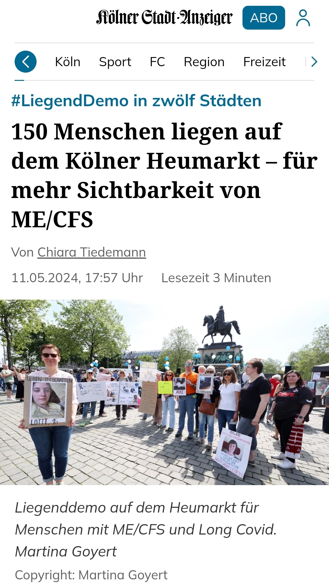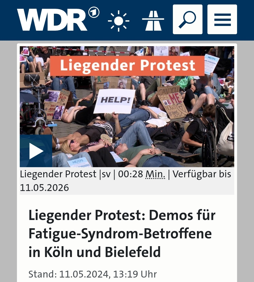 📌 Um 14 Uhr liegen rund 150 Menschen auf dem Kölner Heumarkt. Sie demonstrieren für mehr Sichtbarkeit, eine bessere Forschung und umfassendere Versorgung für eine Krankheit, die bisher kaum im medizinischen Fokus war, als Folge einer Corona-Erkrankung jedoch immer häufiger auftritt.