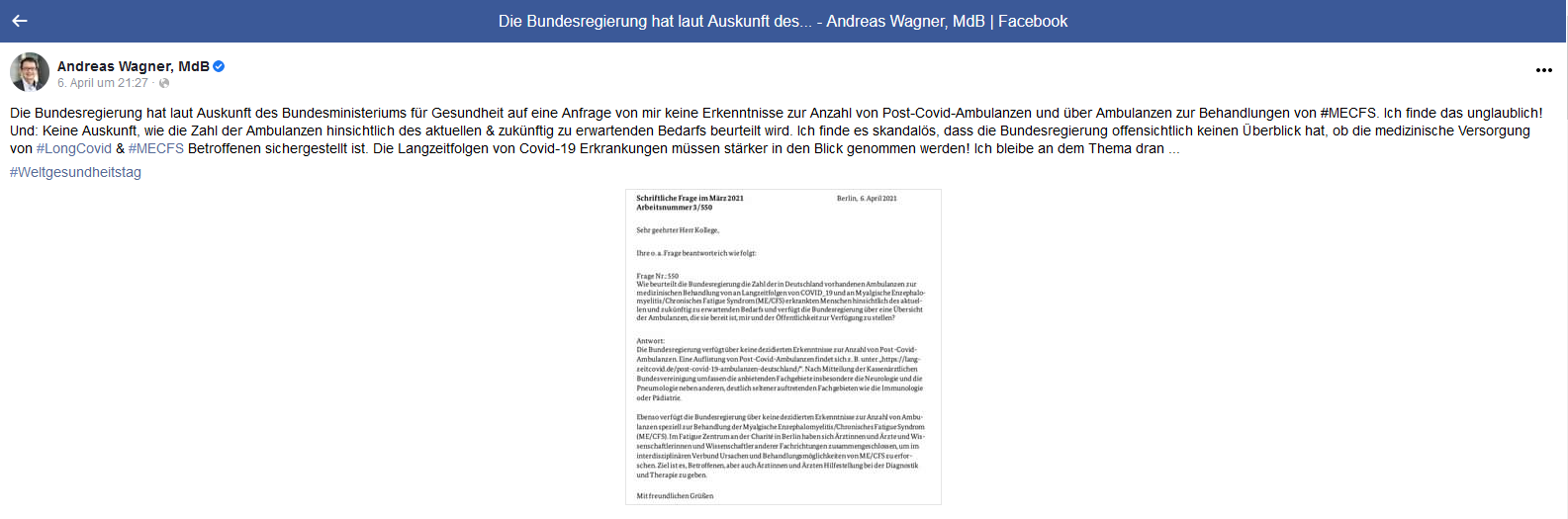 Kommentar schreiben (0 Kommentare)Politiker Andreas Wagner MdB setzt sich für ME/CFS Patienten ein. DANKE!!!