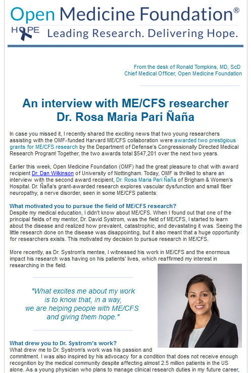 Anfang dieser Woche hatte die Open Medicine Foundation (OMF) das große Vergnügen, mit dem Preisträger Dr. Dan Wilkinson von der Universität Nottingham zu sprechen. Heute freut sich die OMF über ein Interview mit der zweiten Preisträgerin, Dr. Rosa Maria Pari Ñaña vom Brigham & Women's Hospital. Dr. Pari Ñaña erforscht in ihrer Forschung die vaskuläre Dysfunktion und die Small-Fiber-Neuropathie, eine Nervenstörung, die bei einigen ME/CFS-Patienten auftritt: