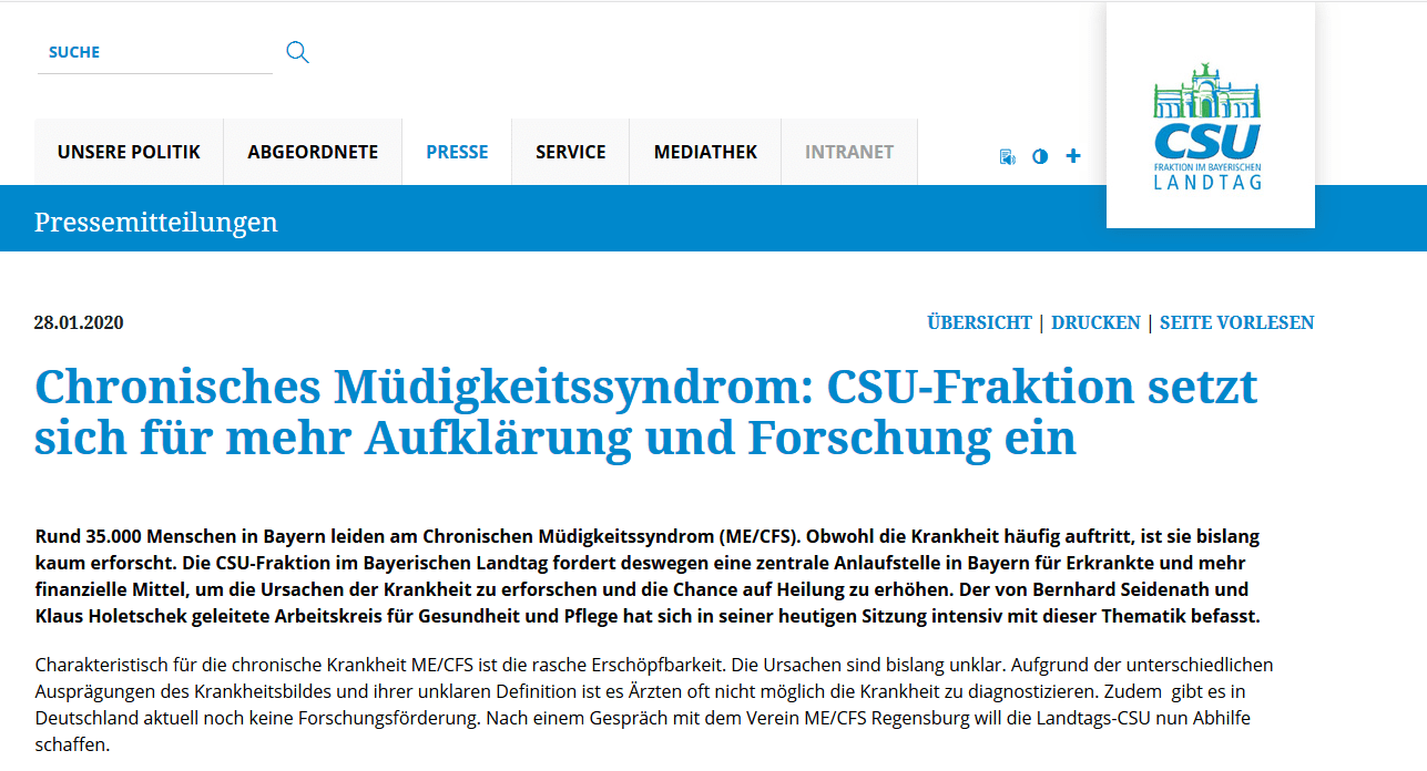 Rund 35.000 Menschen in Bayern leiden am Chronischen Müdigkeitssyndrom (ME/CFS). Obwohl die Krankheit häufig auftritt, ist sie bislang kaum erforscht. Die CSU-Fraktion im Bayerischen Landtag fordert deswegen eine zentrale Anlaufstelle in Bayern für Erkrankte und mehr finanzielle Mittel, um die Ursachen der Krankheit zu erforschen und die Chance auf Heilung zu erhöhen.