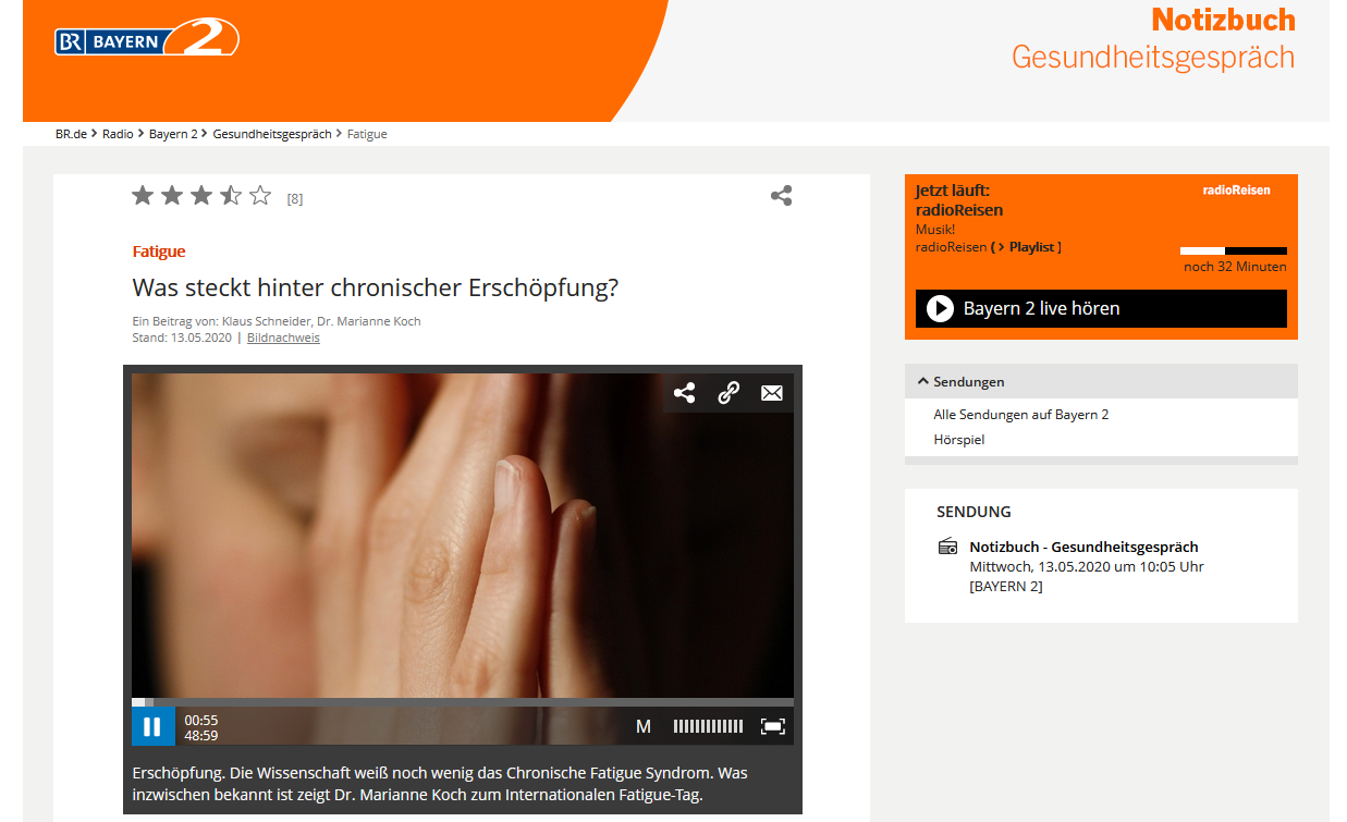 Ein hörenswerter, sehr guter und informativer Beitrag von Klaus Schneider (Bayern Radio), mit Frau Dr. Marianne Koch und Frau Birgit Gustke (Fatigatio) in der Sendung "Notizbuch - Gesundheitsgespräch" am 13.05.2020.