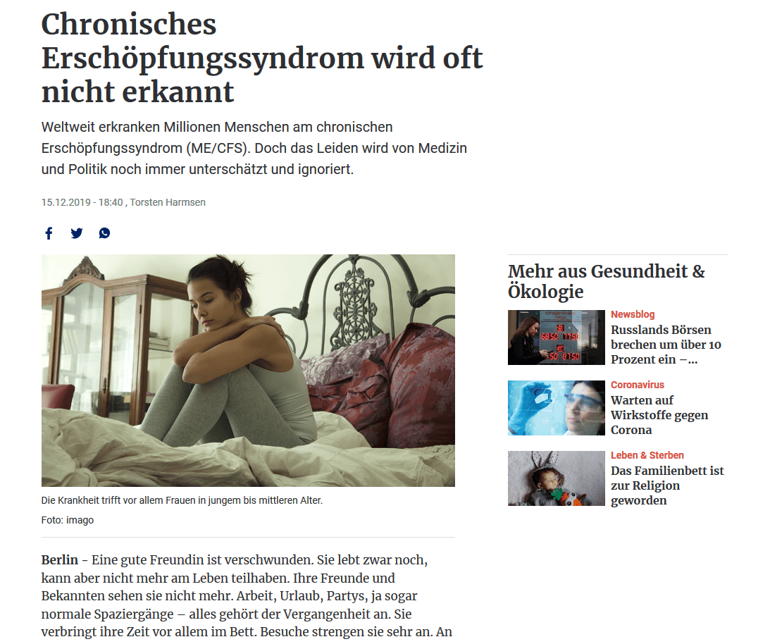 Ein informativer und gut recherchierter Artikel zu ME/CFS. Insbesondere der letzte Satz spricht uns Erkrankten absolut aus dem Herzen: "Die Forschung kann in den nächsten Jahren wahrscheinlich viele Fragen beantworten. Doch dazu müssen endlich in großem Stil Mittel fließen."