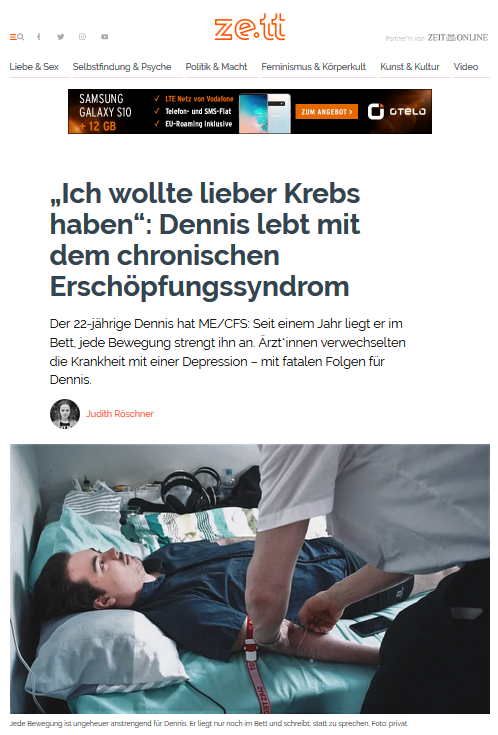 Dennis S. ist schwer krank. Beim 22-Jährigen wurde Anfang des Jahres 2018 ME/CFS diagnostiziert. Das steht für Myalgische Enzephalomyelitis (ME) oder Chronisches Erschöpfungssyndrom (CFS). Eine bisher kaum erforschte Krankheit, die zudem bei Dennis über einen längeren Zeitraum nicht festgestellt wurde. Seine Beschwerden wurden lange Zeit nicht ernstgenommen. Seit Juli 2018 kann Dennis sein Bett nicht mehr verlassen. Unterhaltungen, Essensaufnahme – alles zu anstrengend.