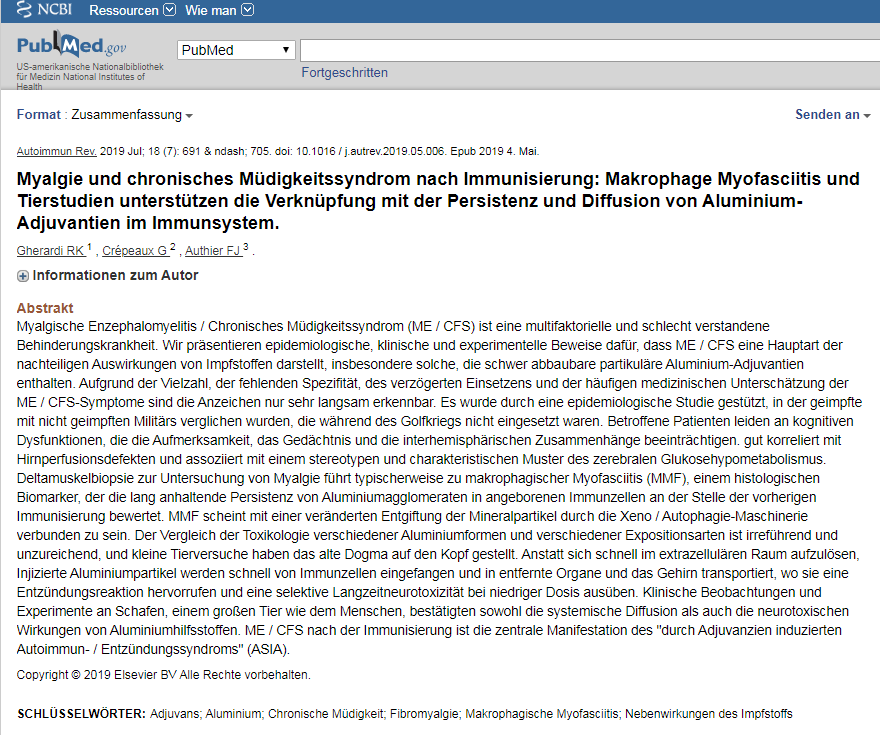 Myalgische Enzephalomyelitis / Chronisches Müdigkeitssyndrom (ME / CFS) ist eine multifaktorielle und schlecht verstandene Behinderungskrankheit. Wir präsentieren epidemiologische, klinische und experimentelle Beweise dafür, dass ME / CFS eine Hauptart der nachteiligen Auswirkungen von Impfstoffen darstellt, insbesondere solche, die schwer abbaubare partikuläre Aluminium-Adjuvantien enthalten.