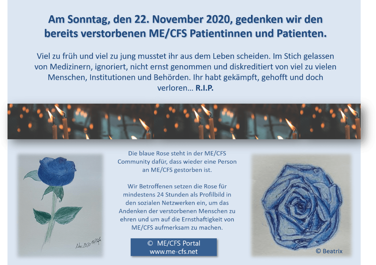 Der Tag, an dem wir unseren Lieben gedenken, an alle, die nicht mehr bei uns sind, aber auch an all diejenigen, die an ME/CFS erkrankt waren und inzwischen verstorben sind. Jedes Jahr sterben so viele ME/CFS Betroffene an dieser schweren Erkrankung. Viele Menschen denken, dass man an ME/CFS nicht sterben kann und indirekt ist das auch so. 20,1% der Verstorbenen haben Suizid begangen und dieser hohe prozentuelle Anteil zeigt, wie schrecklich diese Krankheit ist (genauso hoch ist auch der Anteil derjenigen, die an Herzversagen sterben).