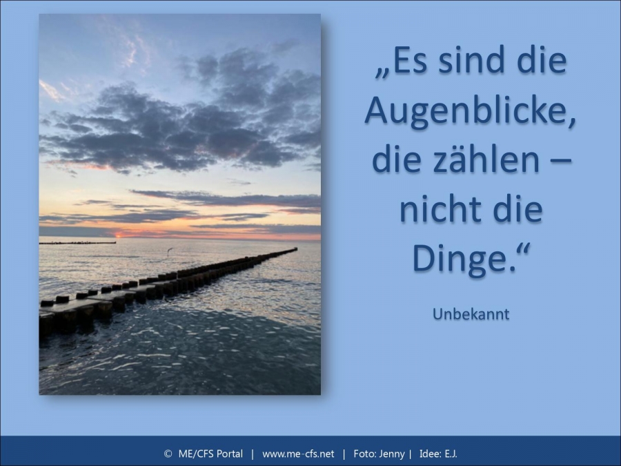 Ja und selbst wenn man die Zeit danach viel im Bett oder auf der Couch verbringen muss, ist dieses Erlebnis doch unbezahlbar. Es sind Momente, von denen unsere Seele zehren kann. Momente, die uns für immer im Kopf bleiben. Momente, die uns helfen in schlechten Phasen den Mut nicht zu verlieren. Leider ist dies nicht allen ME/CFS Betroffenen gegönnt und so bleibt eben nur die Erinnerung an das Gefühl von Meeresluft und Sand unter den Füßen...
