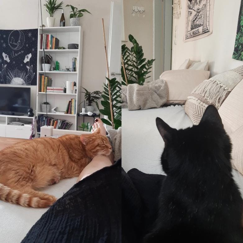 Paul, ein stattlicher roter Kater, der aber meist eher wie ein tapsiger, etwas tollpatschiger Bär unterwegs ist und Odin, mein schwarzer Panther in Miniformat, immer leichtfüßig und anmutig wie ein eben solcher unterwegs...
